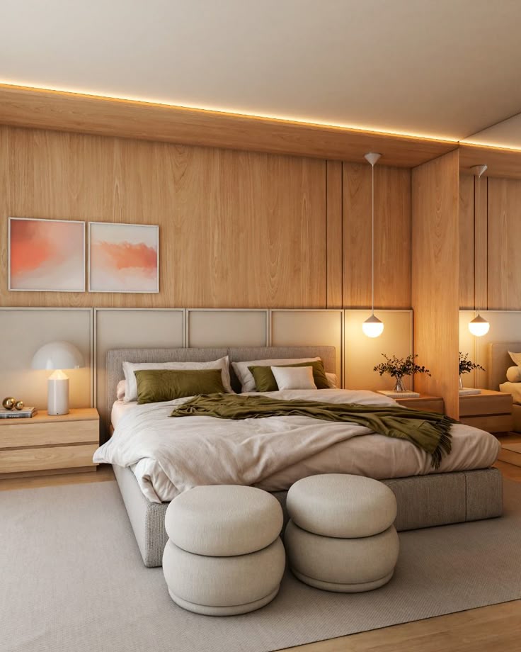 Combinar luz geral, de tarefa e de destaque é essencial para criar um quarto verdadeiramente confortável e funcional.